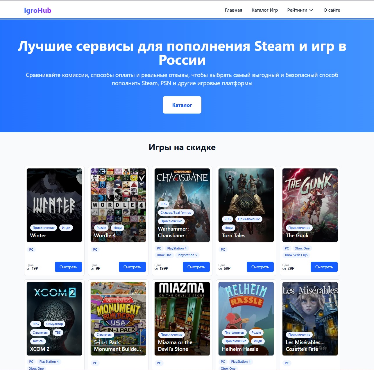 Igrohub — plataforma digital orientada al mercado ruso y europeo que agrega servicios de recarga (Steam, PSN, gift cards) y compara ofertas de juegos digitales según precio, reputación y valoraciones. El objetivo principal del proyecto es facilitar la elección del servicio más выгодного (rentable) y fiable para el usuario final.